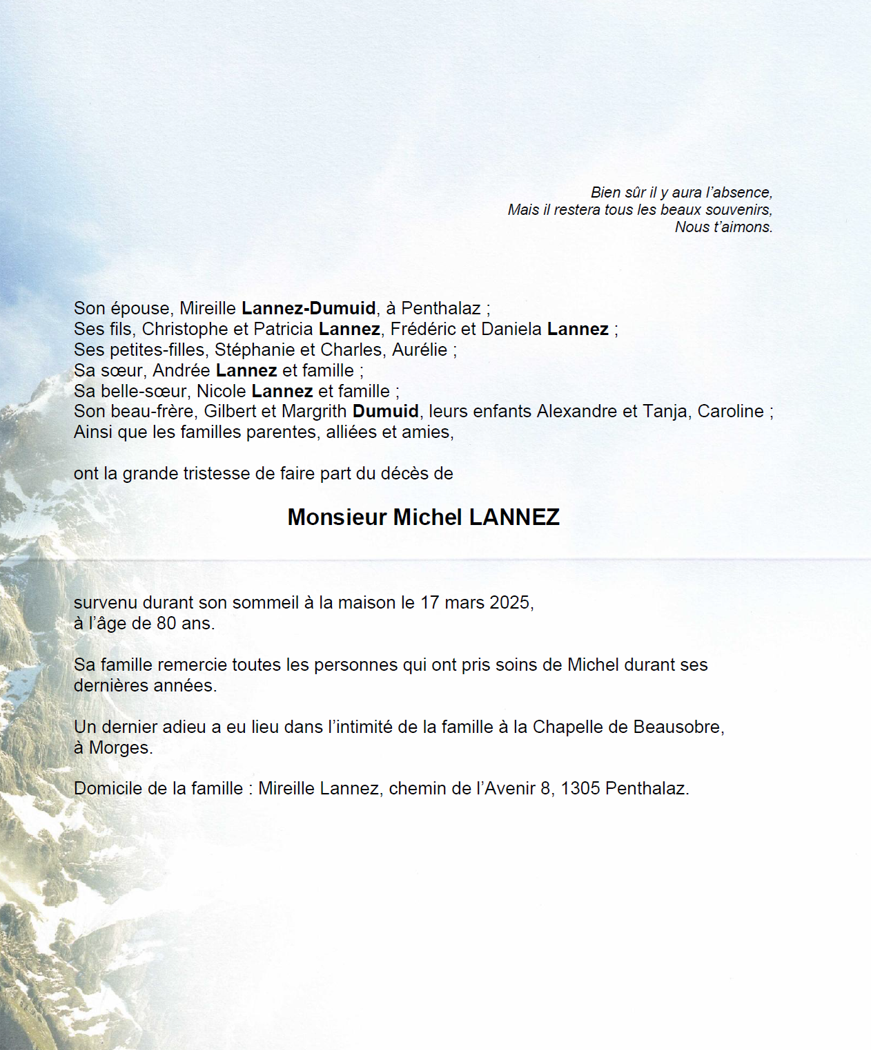 Monsieur Michel LANNEZ 14 déc. 1944 - 17 mar. 2025 Avis mortuaire PFG Télecharger PDF Partager sur: Galerie