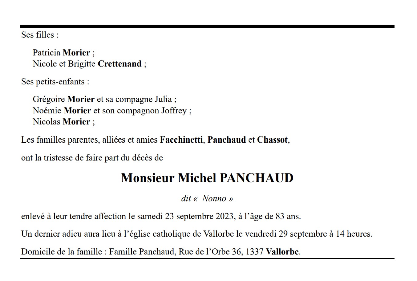 Monsieur Michel PANCHAUD dit « Nonno » 19 fév. 1940 - 23 sep. 2023 Avis mortuaire PFG Télecharger PDF Partager sur: Galerie