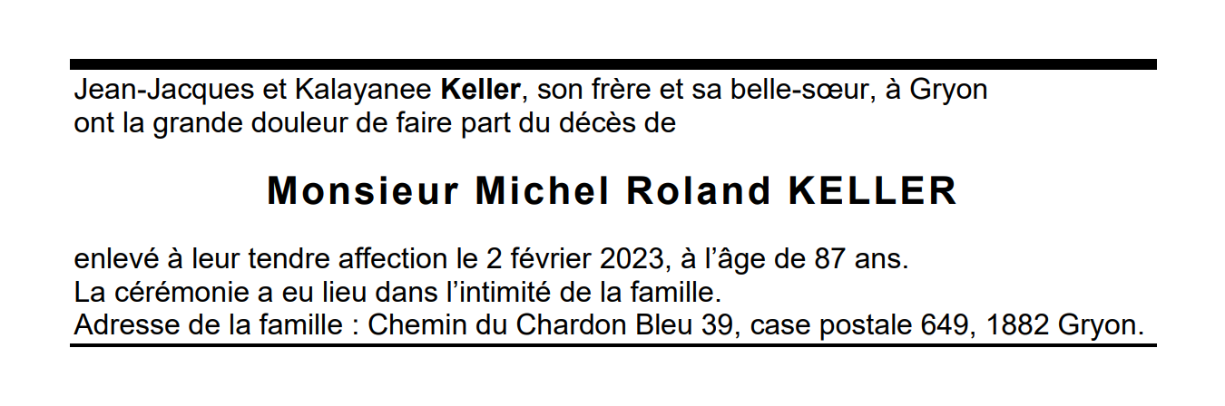 Monsieur Michel Roland KELLER 20 aoû. 1935 - 02 fév. 2023 Avis mortuaire PFG Télecharger PDF Partager sur: Galerie PreviousNext PreviousNext