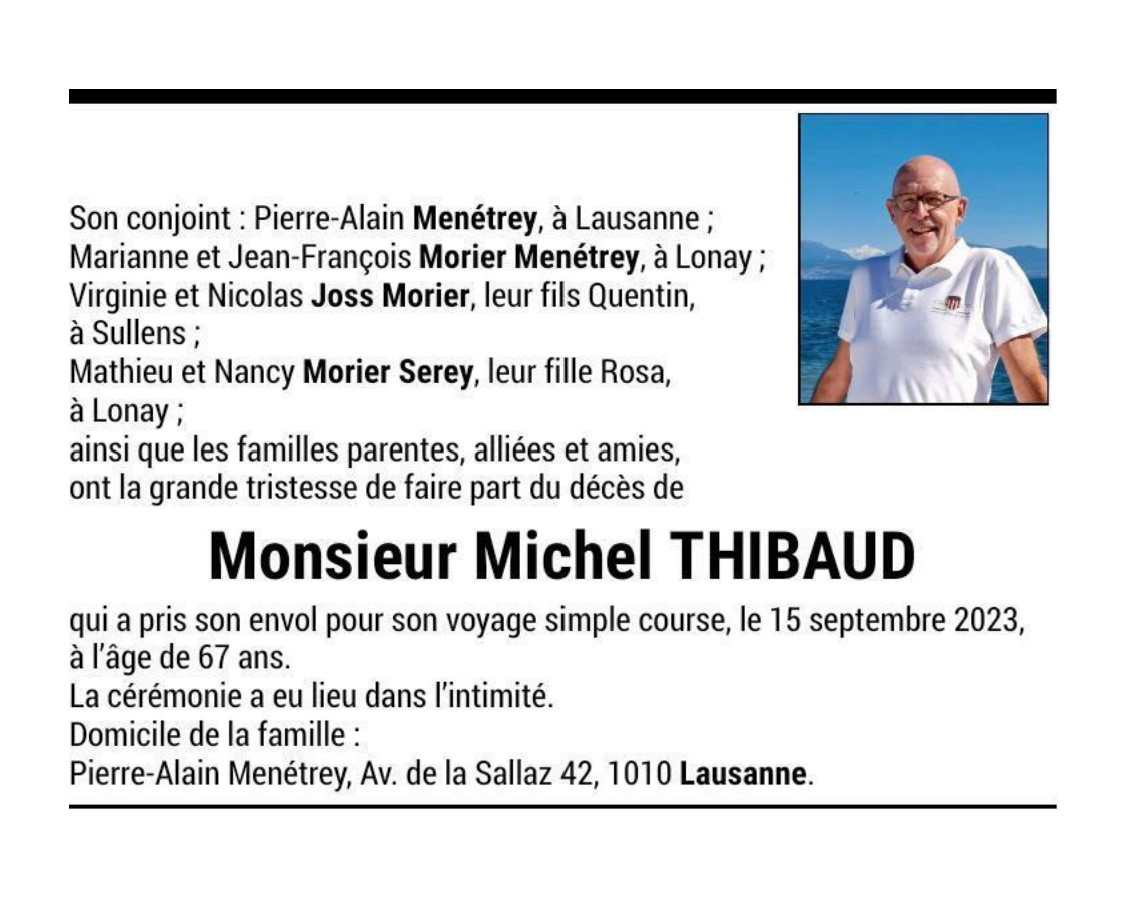 Monsieur Michel THIBAUD 06 sep. 1956 - 15 sep. 2023 Avis mortuaire PFG Télecharger PDF Partager sur: Galerie PreviousNext PreviousNext