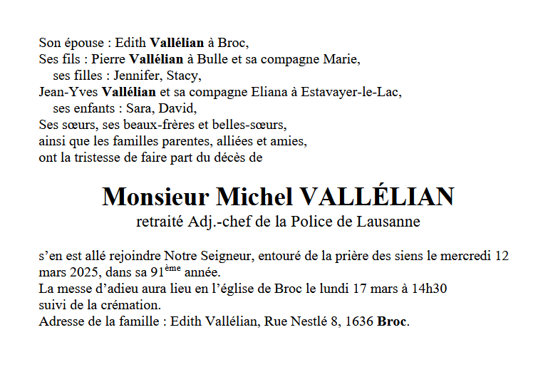 Monsieur Michel VALLÉLIAN 17 aoû. 1934 - 12 mar. 2025 Avis mortuaire PFG Télecharger PDF Partager sur:
