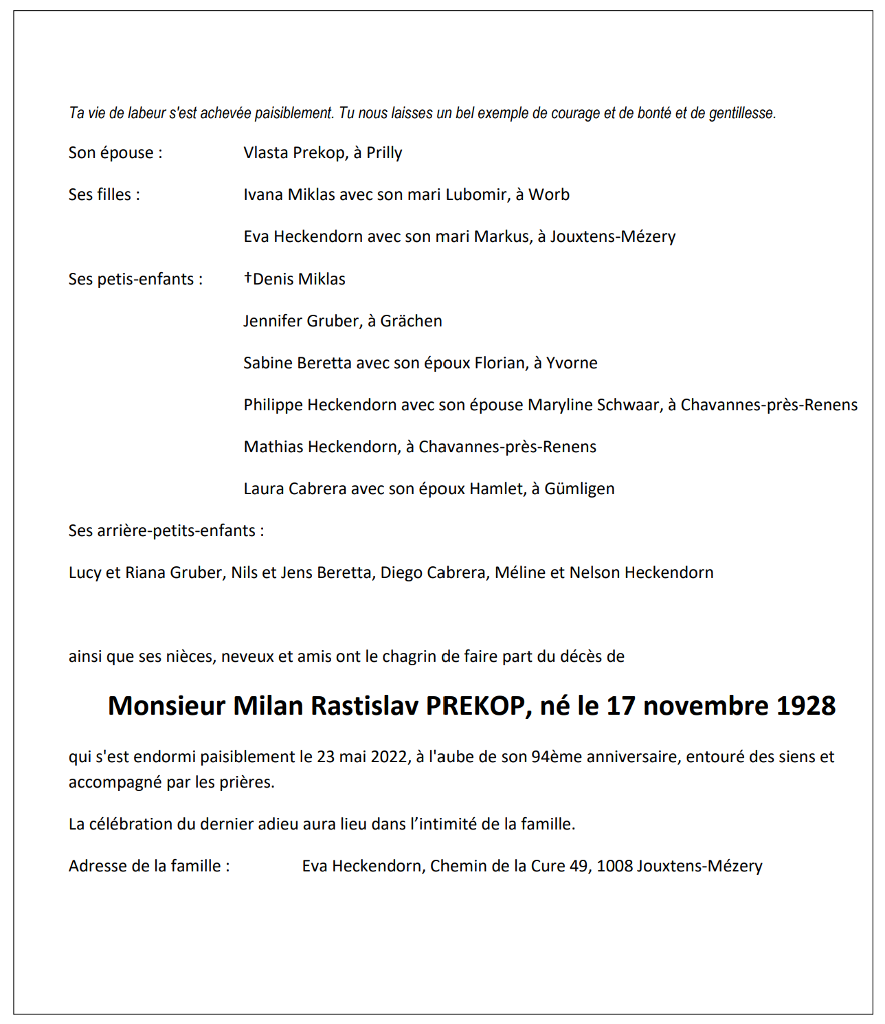Monsieur Milan Rastislav PREKOP 17 nov. 1928 - 23 mai. 2022 Avis mortuaire PFG Télecharger PDF Partager sur: Galerie PreviousNext PreviousNext