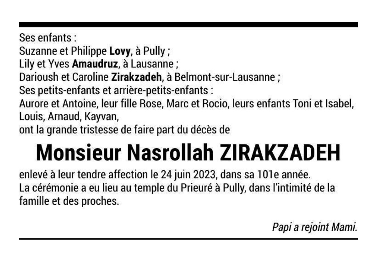 Monsieur Nasrollah ZIRAKZADEH 03 oct. 1922 - 24 juin. 2023 Avis mortuaire PFG Télecharger PDF Partager sur: Galerie PreviousNext PreviousNext