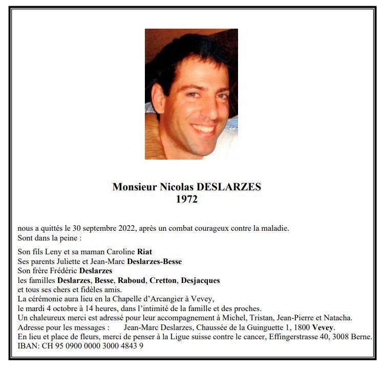 Monsieur Nicolas DESLARZES 30 jan. 1972 - 30 sep. 2022 Avis mortuaire PFG Télecharger PDF Partager sur: Galerie PreviousNext PreviousNext