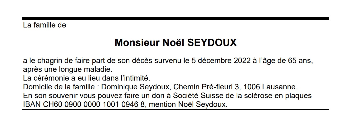 Monsieur Noël SEYDOUX 26 nov. 1957 - 05 déc. 2022 Avis mortuaire PFG Télecharger PDF Partager sur: Galerie PreviousNext PreviousNext