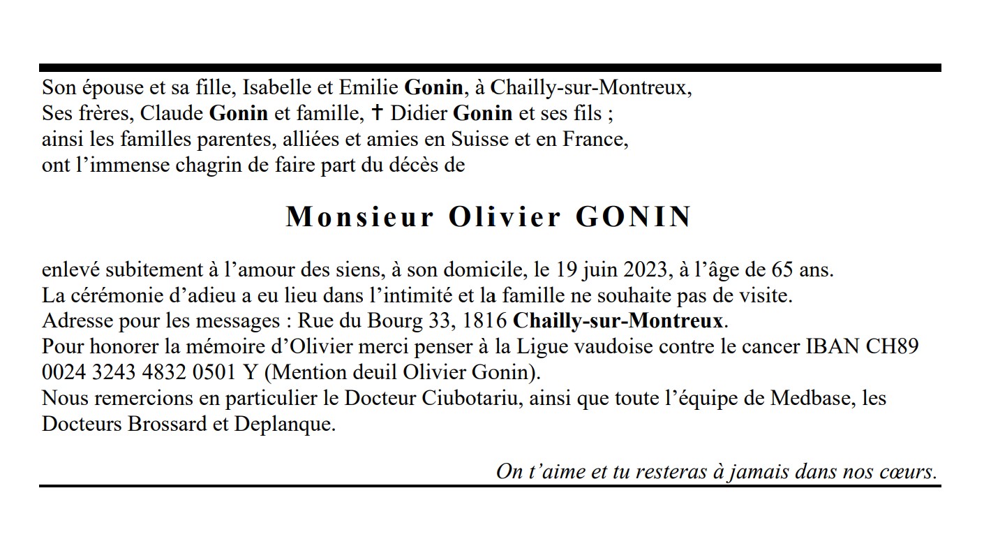 Monsieur Olivier GONIN 14 juin. 1958 - 19 juin. 2023 Avis mortuaire PFG Télecharger PDF Partager sur: Galerie PreviousNext PreviousNext