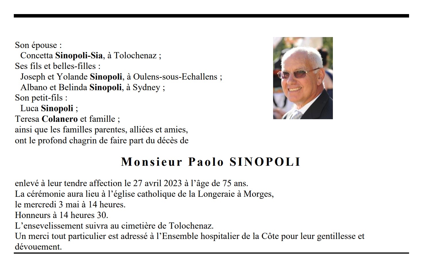 Monsieur Paolo SINOPOLI 21 oct. 1947 - 27 avr. 2023 Avis mortuaire PFG Télecharger PDF Partager sur: Galerie PreviousNext PreviousNext