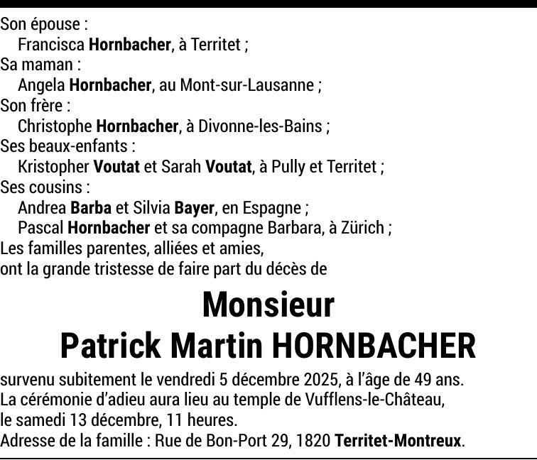 Monsieur Patrick Martin HORNBACHER 31 jan. 1976 - 05 déc. 2025 Avis mortuaire PFG Partager sur: Galerie