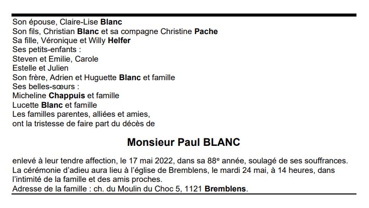 Monsieur Paul BLANC 29 sep. 1934 - 17 mai. 2022 Avis mortuaire PFG Télecharger PDF Partager sur: Galerie PreviousNext PreviousNext