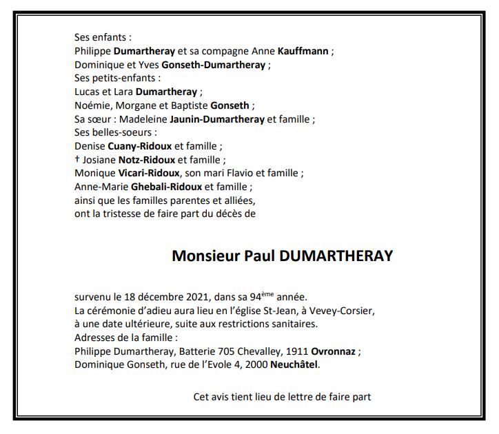 Monsieur Paul DUMARTHERAY 01 jan. 1928 - 18 déc. 2021 Avis mortuaire PFG Télecharger PDF Partager sur: Galerie PreviousNext PreviousNext