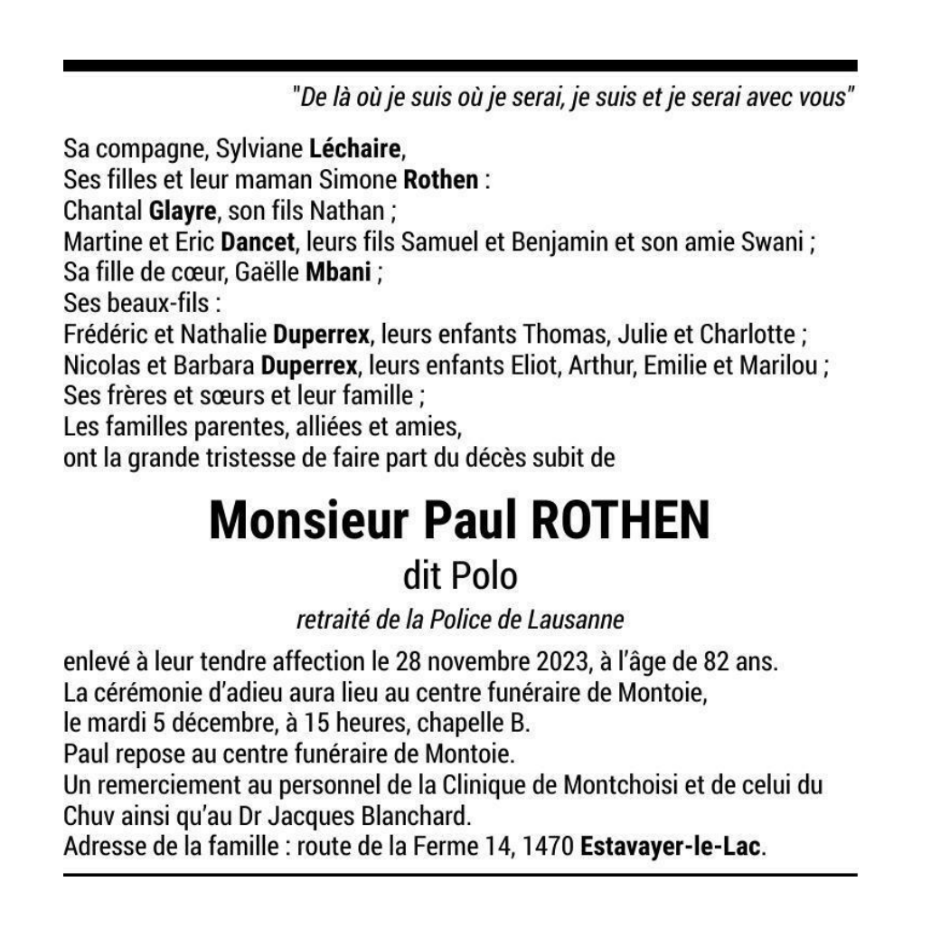 Monsieur Paul ROTHEN dit Polo 03 aoû. 1941 - 28 nov. 2023 Avis mortuaire PFG Télecharger PDF Partager sur: Galerie PreviousNext PreviousNext