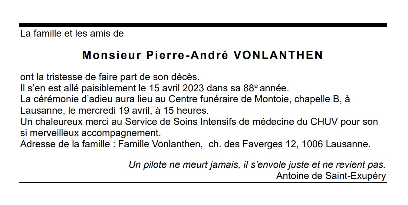 Monsieur Pierre-André VONLANTHEN 05 aoû. 1935 - 15 avr. 2023 Avis mortuaire PFG Télecharger PDF Partager sur: Galerie PreviousNext PreviousNext