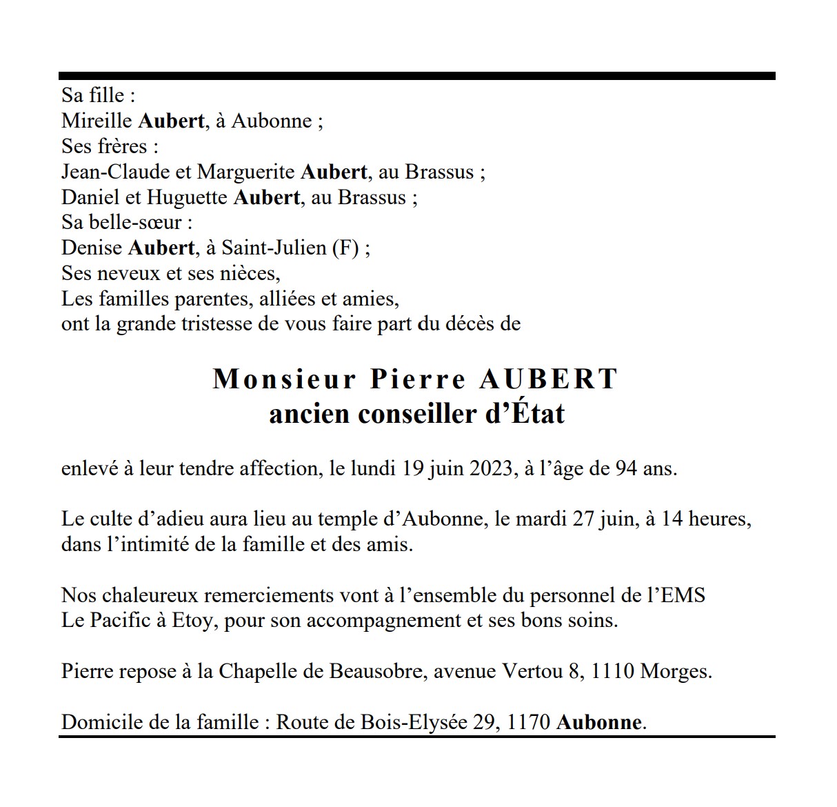 Monsieur Pierre AUBERT ancien conseiller d’État 01 fév. 1929 - 19 juin. 2023 Avis mortuaire PFG Télecharger PDF Partager sur: Galerie PreviousNext PreviousNext