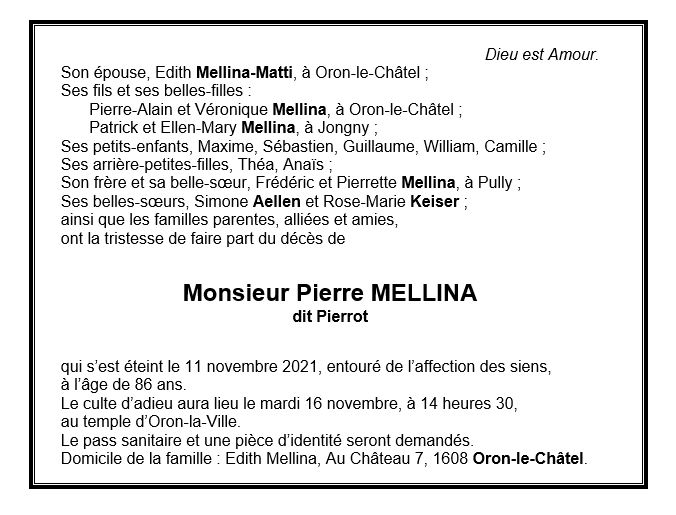 Monsieur Pierre MELLINA 26 fév. 1935 - 11 nov. 2021 Avis mortuaire PFG Télecharger PDF Partager sur: Galerie PreviousNext PreviousNext