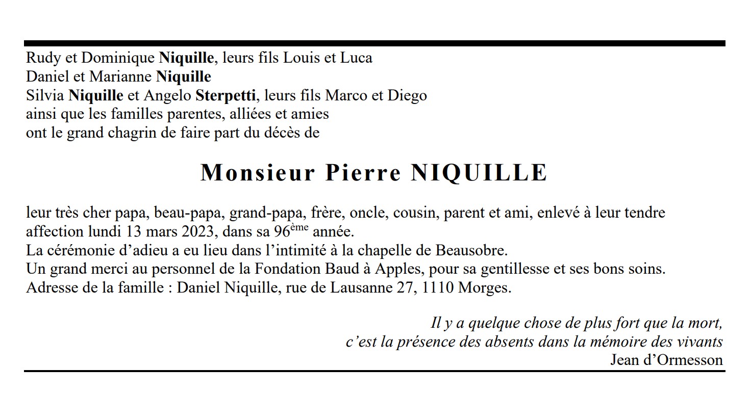 Monsieur Pierre NIQUILLE 27 juin. 1927 - 13 mar. 2023 Avis mortuaire PFG Télecharger PDF Partager sur: Galerie PreviousNext PreviousNext
