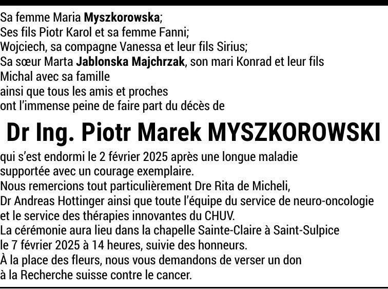 Monsieur Piotr Marek MYSZKOROWSKI 30 mar. 1956 - 02 fév. 2025 Avis mortuaire PFG Partager sur: Galerie
