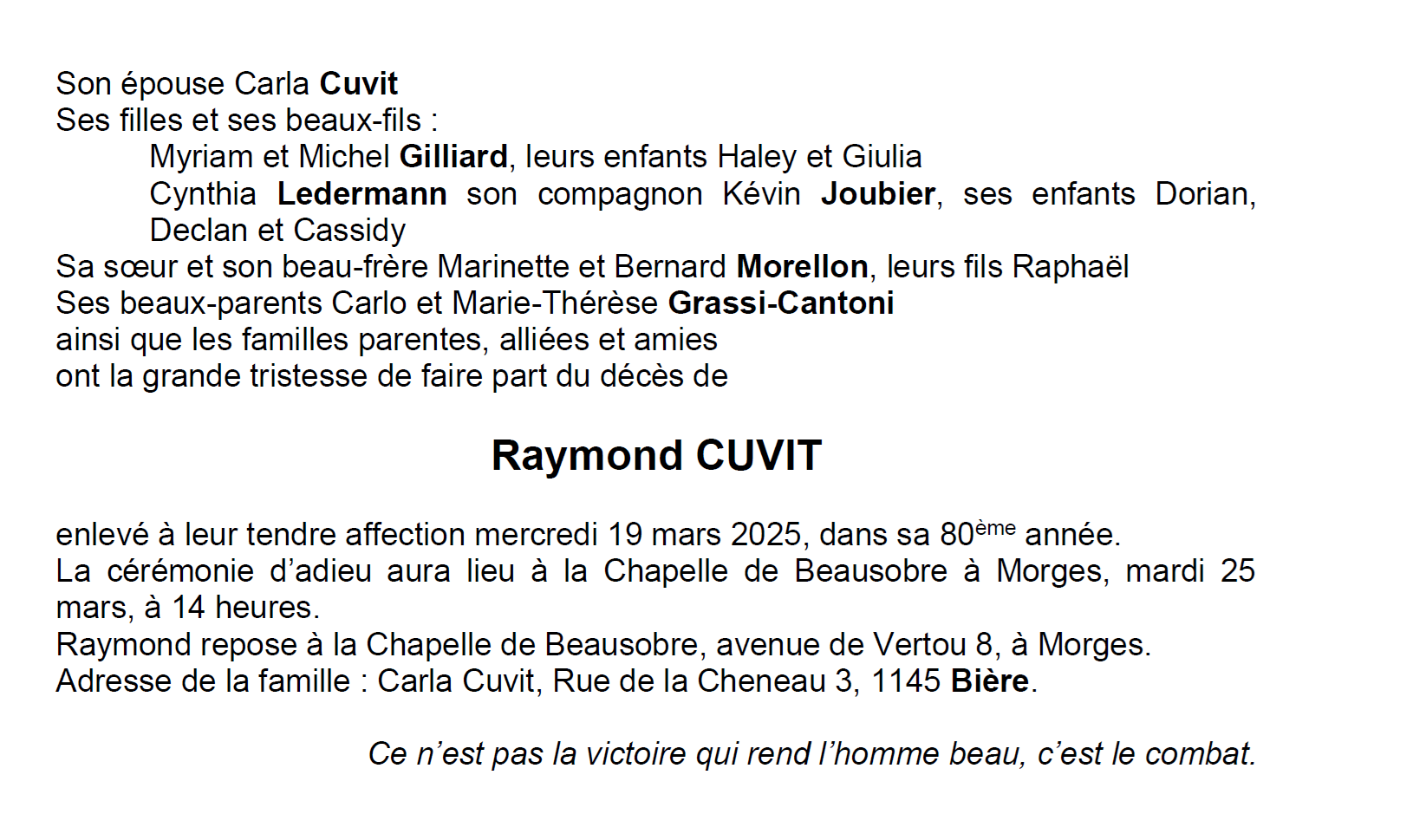 Monsieur Raymond CUVIT 18 oct. 1945 - 19 mar. 2025 Avis mortuaire PFG Télecharger PDF Partager sur: Galerie