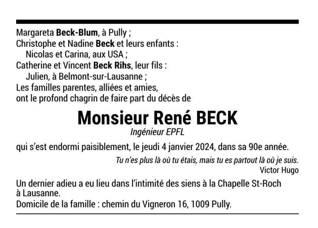 Monsieur René BECK Ingénieur EPFL 03 nov. 1934 - 04 jan. 2024 Avis mortuaire PFG Télecharger PDF Partager sur: Galerie PreviousNext PreviousNext