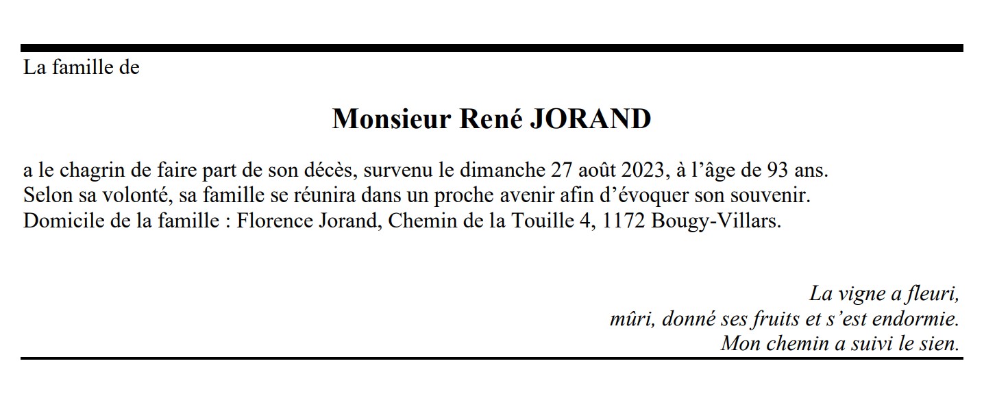 Monsieur René JORAND 12 juin. 1930 - 27 aoû. 2023 Avis mortuaire PFG Télecharger PDF Partager sur: Galerie PreviousNext PreviousNext