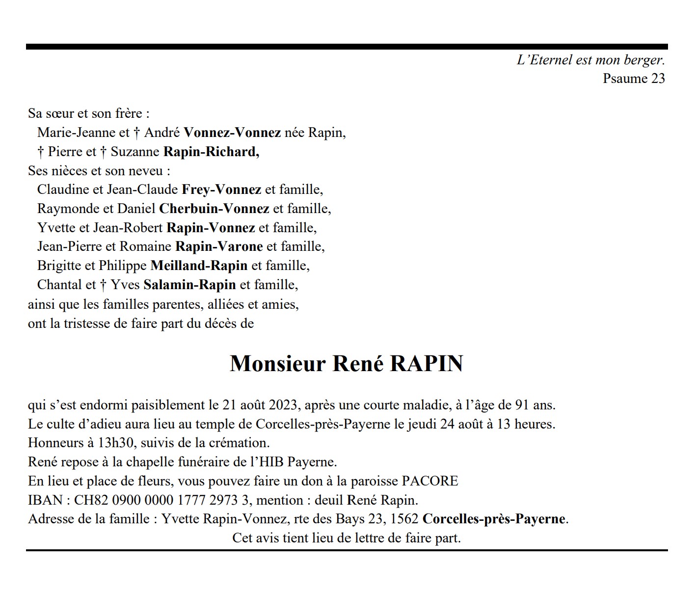 Monsieur René RAPIN 17 mar. 1932 - 21 aoû. 2023 Avis mortuaire PFG Télecharger PDF Partager sur: Galerie PreviousNext PreviousNext