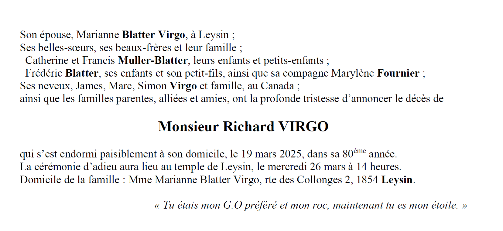 Monsieur Richard VIRGO 25 juin. 1945 - 19 mar. 2025 Avis mortuaire PFG Télecharger PDF Partager sur: Galerie