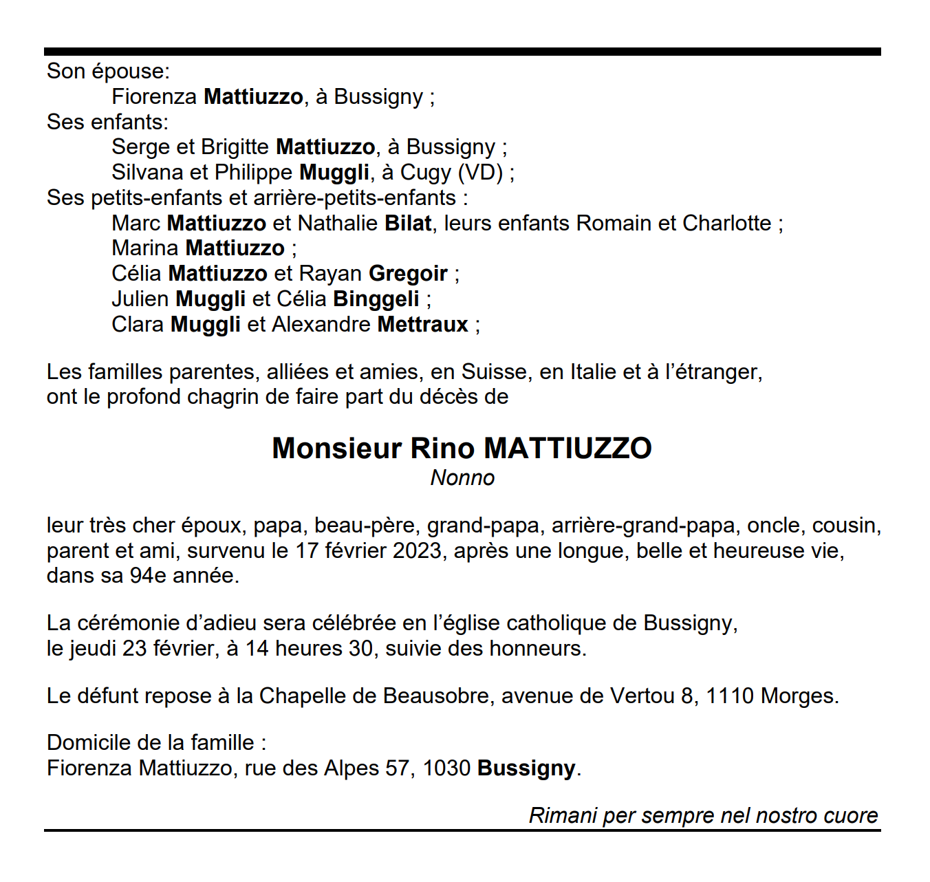 Monsieur Rino MATTIUZZO 07 mai. 1929 - 17 fév. 2023 Avis mortuaire PFG Télecharger PDF Partager sur: Galerie PreviousNext PreviousNext
