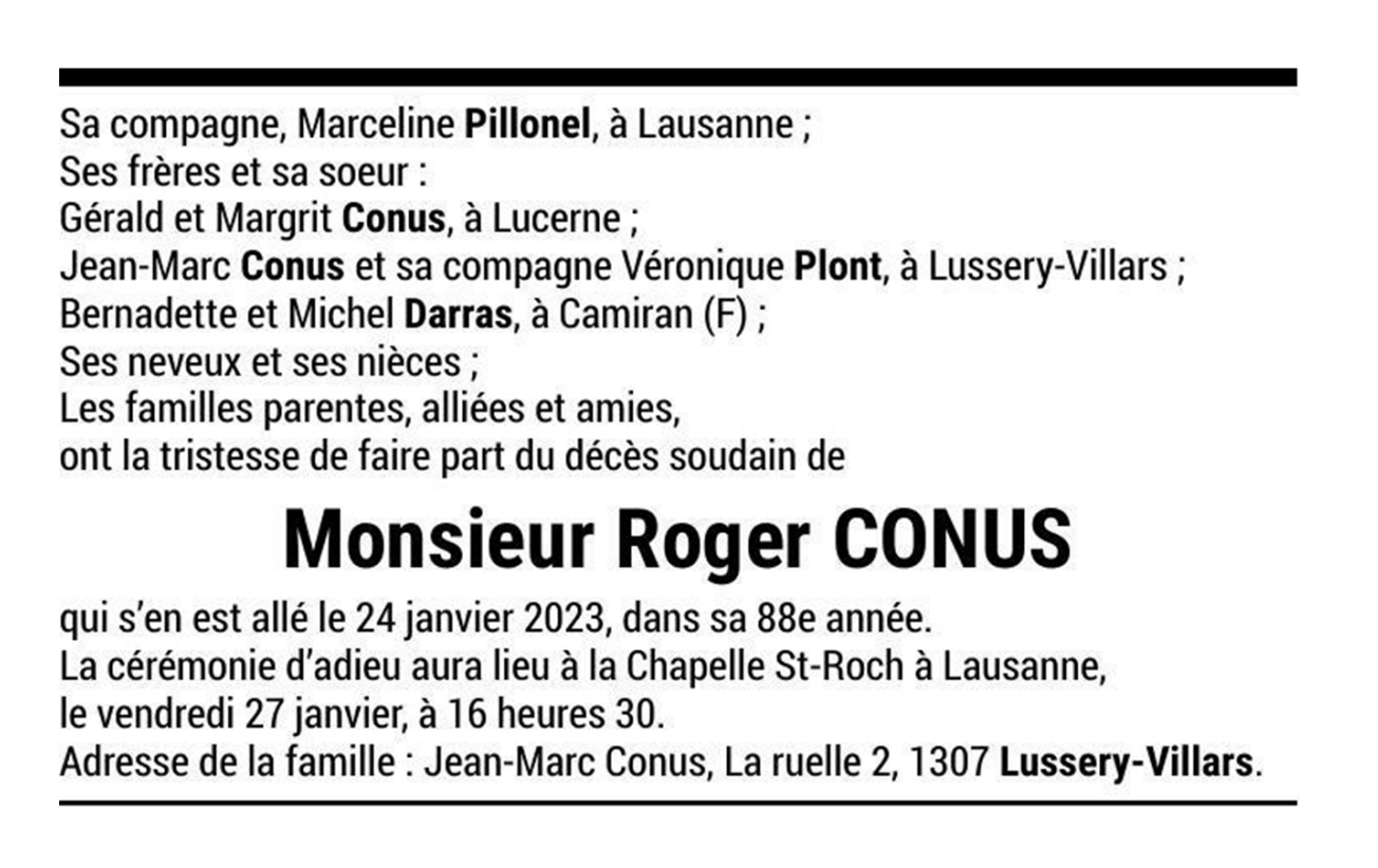Monsieur Roger CONUS 24 oct. 1935 - 24 jan. 2023 Avis mortuaire PFG Télecharger PDF Partager sur: Galerie PreviousNext PreviousNext