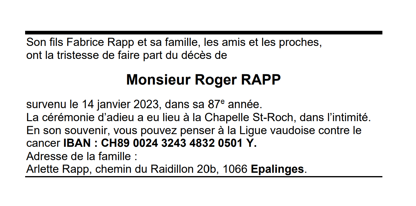 Monsieur Roger RAPP 18 aoû. 1936 - 14 jan. 2023 Avis mortuaire PFG Télecharger PDF Partager sur: Galerie PreviousNext PreviousNext