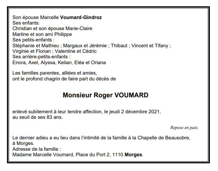 Monsieur Roger VOUMARD 12 jan. 1939 - 02 déc. 2021 Avis mortuaire PFG Télecharger PDF Partager sur: Galerie PreviousNext PreviousNext