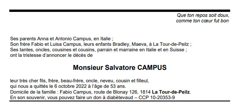 Monsieur Salvatore CAMPUS 29 jan. 1969 - 06 oct. 2022 Avis mortuaire PFG Télecharger PDF Partager sur: Galerie PreviousNext PreviousNext