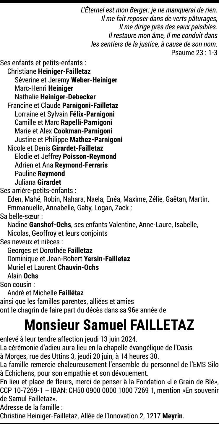 Monsieur Samuel FAILLETAZ 23 avr. 1929 - 13 juin. 2024 Avis mortuaire PFG Partager sur: Galerie PreviousNext PreviousNext