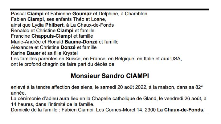 Monsieur Sandro CIAMPI 04 juil. 1941 - 20 aoû. 2022 Avis mortuaire PFG Télecharger PDF Partager sur: Galerie PreviousNext PreviousNext