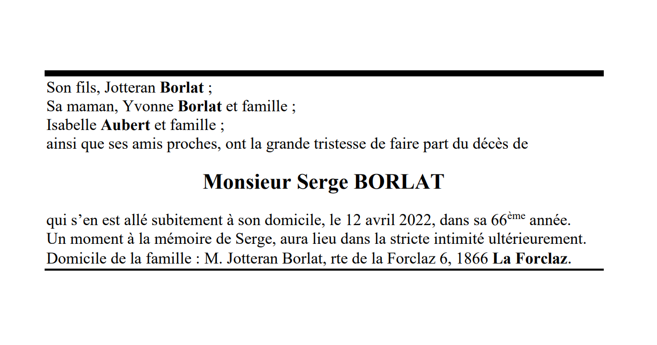 Monsieur Serge BORLAT 19 aoû. 1956 - 12 avr. 2022 Avis mortuaire PFG Télecharger PDF Partager sur: Galerie PreviousNext PreviousNext