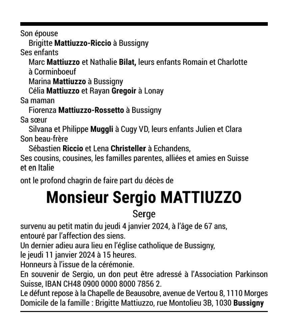Monsieur Sergio MATTIUZZO Serge 03 oct. 1956 - 04 jan. 2024 Avis mortuaire PFG Télecharger PDF Partager sur: Galerie PreviousNext PreviousNext