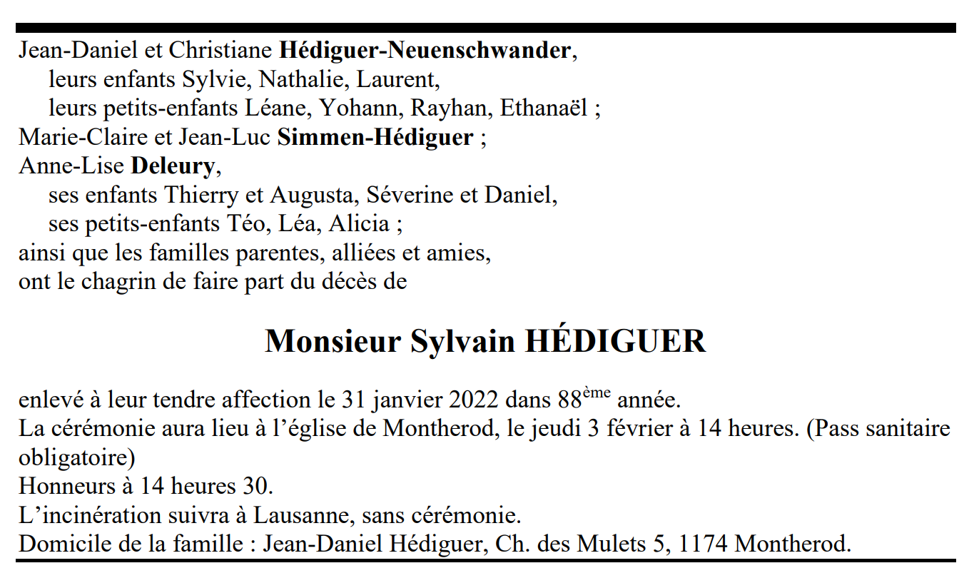Monsieur Sylvain HÉDIGUER 28 déc. 1934 - 31 jan. 2022 Avis mortuaire PFG Télecharger PDF Partager sur: Galerie PreviousNext PreviousNext