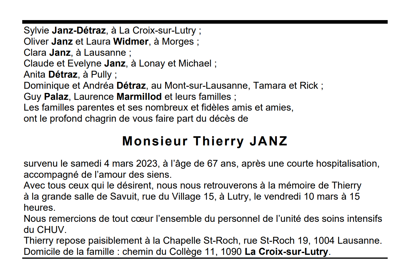Monsieur Thierry JANZ 21 sep. 1955 - 04 mar. 2023 Avis mortuaire PFG Télecharger PDF Partager sur: Galerie PreviousNext PreviousNext