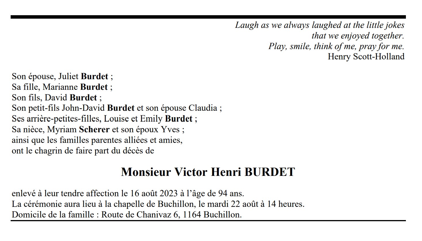 Monsieur Victor Henri BURDET 11 mai. 1929 - 16 aoû. 2023 Avis mortuaire PFG Télecharger PDF Partager sur: Galerie PreviousNext PreviousNext