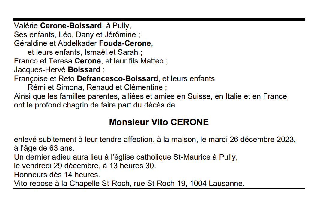Monsieur Vito CERONE 24 nov. 1960 - 26 déc. 2023 Avis mortuaire PFG Télecharger PDF Partager sur: Galerie PreviousNext PreviousNext