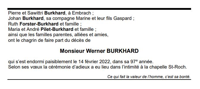 Monsieur Werner BURKHARD 07 avr. 1925 - 14 fév. 2022 Avis mortuaire PFG Télecharger PDF Partager sur: Galerie PreviousNext PreviousNext
