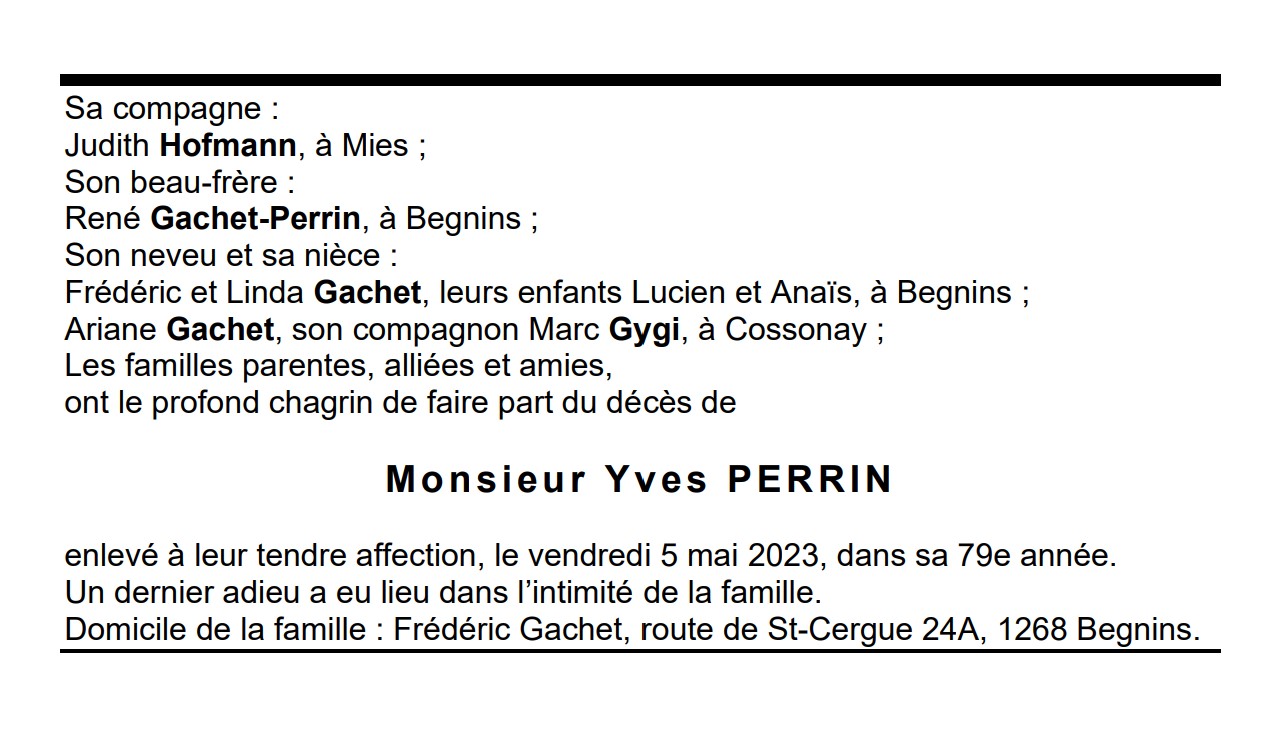 Monsieur Yves PERRIN 17 nov. 1944 - 05 mai. 2023 Avis mortuaire PFG Télecharger PDF Partager sur: Galerie PreviousNext PreviousNext