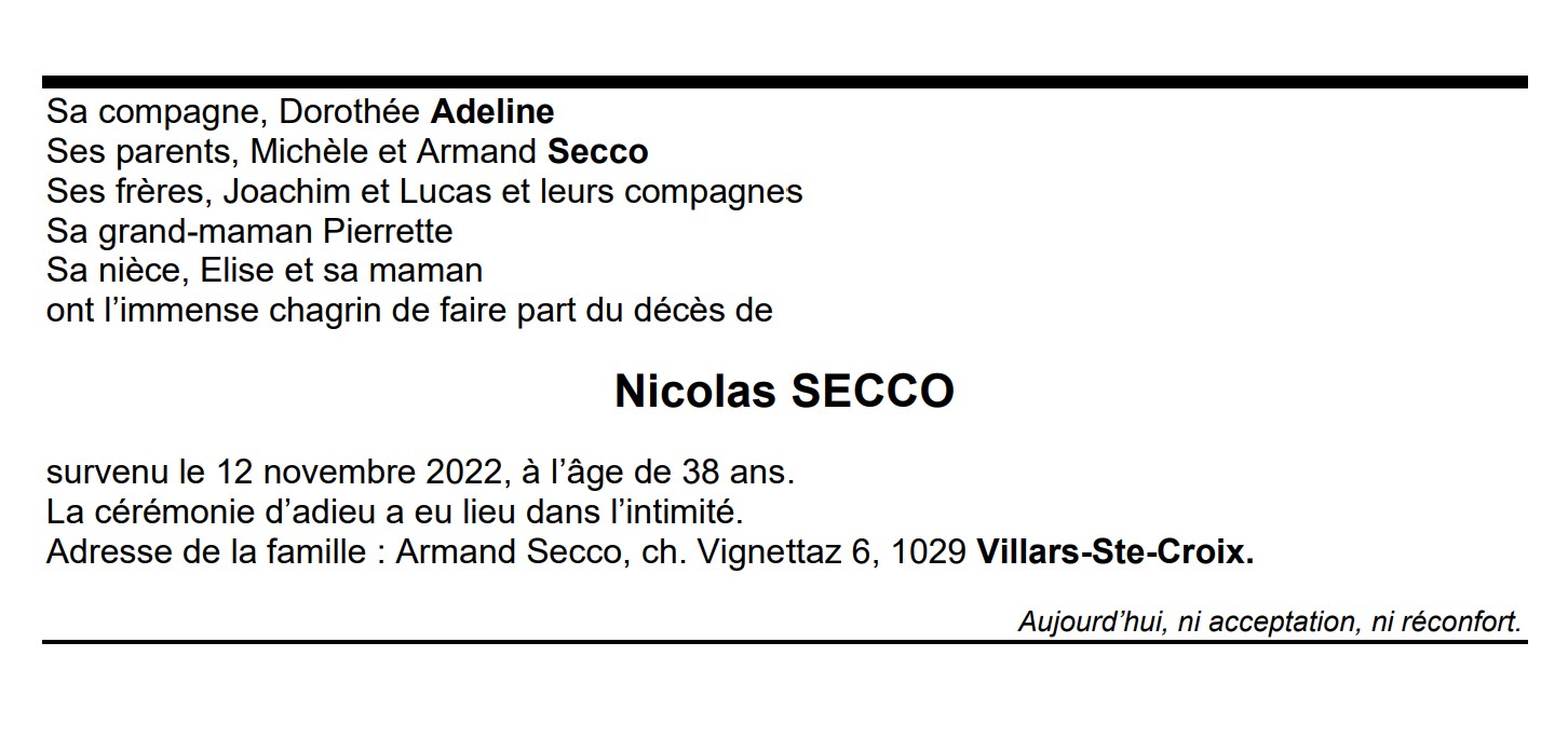Nicolas SECCO 23 jan. 1984 - 12 nov. 2022 Avis mortuaire PFG Télecharger PDF Partager sur: Galerie PreviousNext PreviousNext