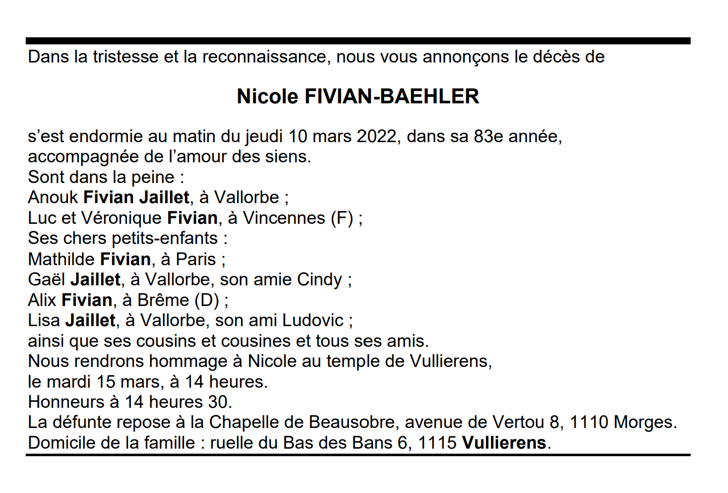 Nicole FIVIAN-BAEHLER 23 aoû. 1939 - 10 mar. 2022 Avis mortuaire PFG Télecharger PDF Partager sur: Galerie PreviousNext PreviousNext