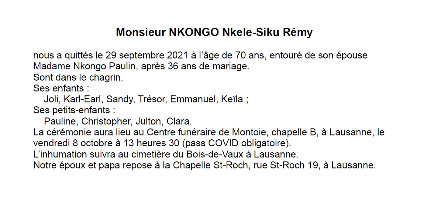 NKONGO Nkele-Siku Rémy 08 sep. 1951 - 29 sep. 2021 Avis mortuaire PFG Télecharger PDF Partager sur: Galerie PreviousNext PreviousNext