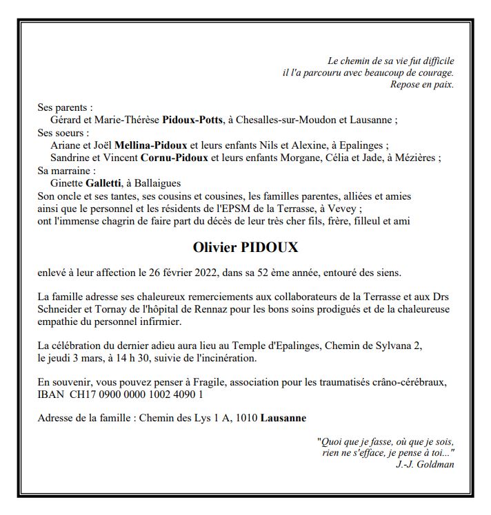 Olivier PIDOUX 13 jan. 1970 - 26 fév. 2022 Avis mortuaire PFG Télecharger PDF Partager sur: Galerie PreviousNext PreviousNext