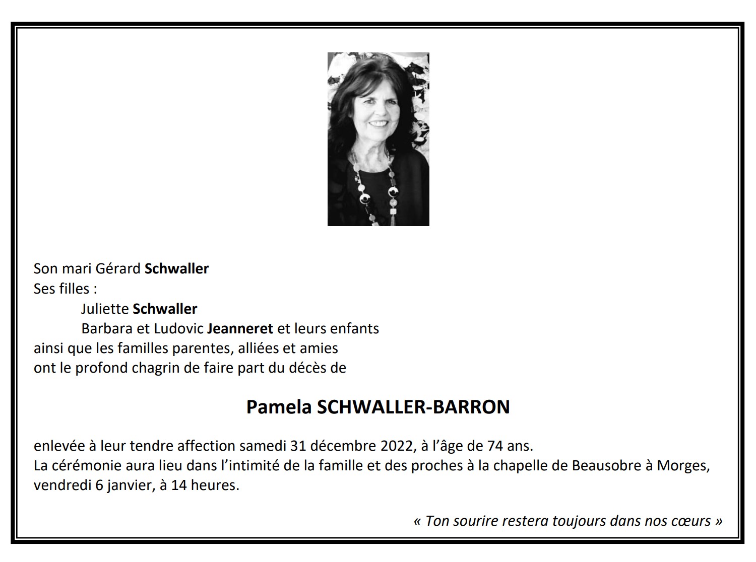 Pamela SCHWALLER-BARRON 16 juin. 1948 - 31 déc. 2022 Avis mortuaire PFG Télecharger PDF Partager sur: Galerie PreviousNext PreviousNext