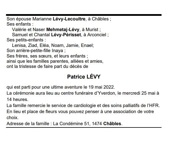 Patrice LÉVY 11 oct. 1949 - 19 mai. 2022 Avis mortuaire PFG Télecharger PDF Partager sur: Galerie PreviousNext PreviousNext