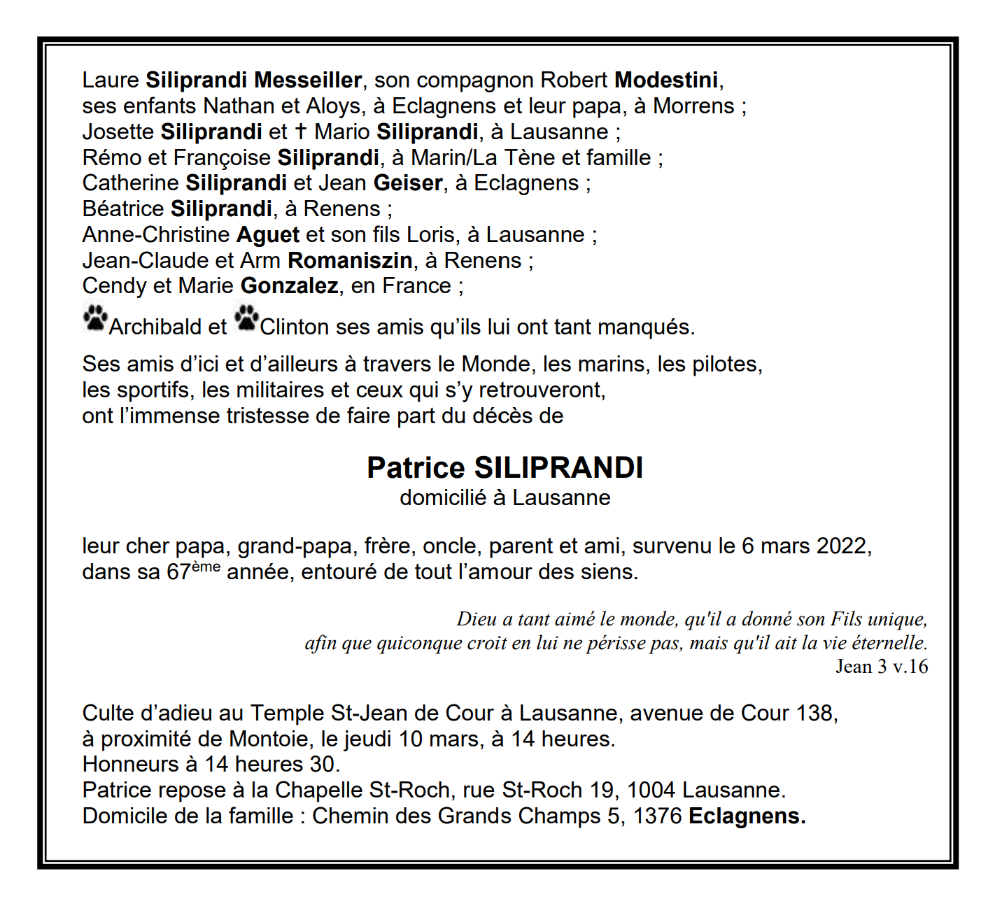 Patrice SILIPRANDI 29 sep. 1955 - 06 mar. 2022 Avis mortuaire PFG Télecharger PDF Partager sur: Galerie PreviousNext PreviousNext