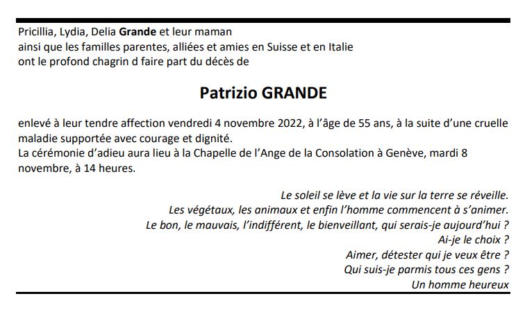 Patrizio GRANDE 30 juil. 1967 - 04 nov. 2022 Avis mortuaire PFG Télecharger PDF Partager sur: Galerie PreviousNext PreviousNext