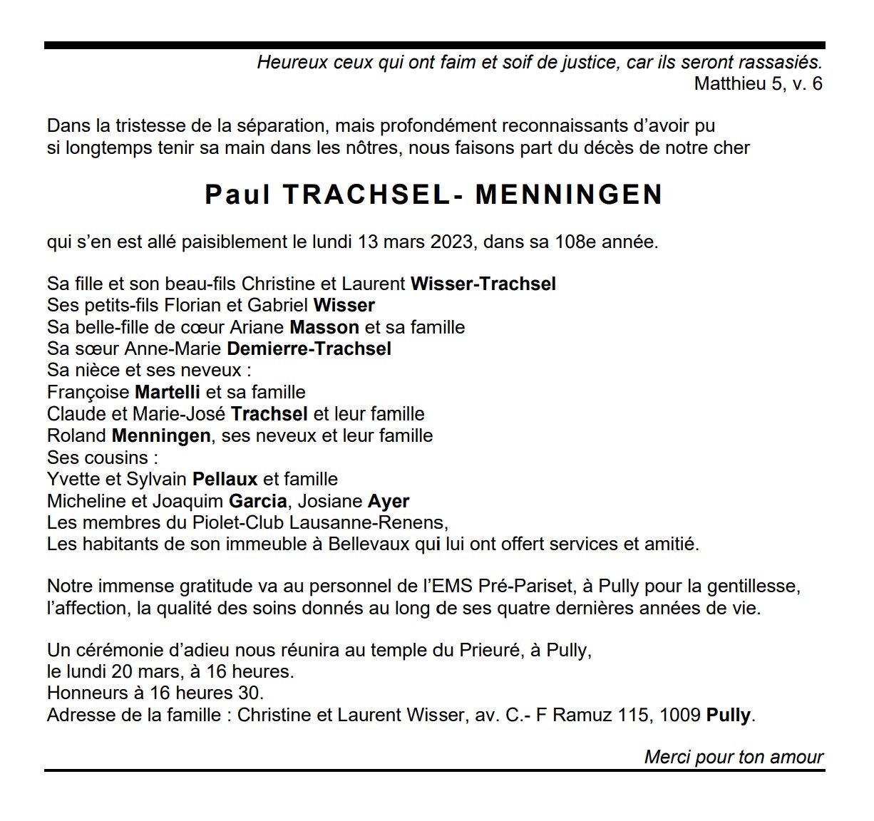 Paul TRACHSEL- MENNINGEN 22 juin. 1915 - 13 mar. 2023 Avis mortuaire PFG Télecharger PDF Partager sur: Galerie PreviousNext PreviousNext