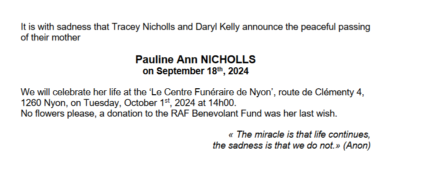 Pauline Ann NICHOLLS 12 aoû. 1936 - 19 sep. 2024 Avis mortuaire PFG Télecharger PDF Partager sur: Galerie